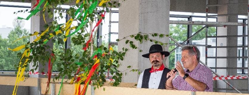 „Mit Gunst und Verlaub, es ist seit guter alter Zeit der Brauch, das Richtfest zu begehen. Das meint der Bauherr sicher auch und all die Leut’ die heut hier stehen. Ein Dach aus Holz, das seht ihr nicht, innovativ, modern mit neuem Gesicht. Hier waren Beton, Glas und Stahl für den Statiker erste Wahl. Die Architekten, Betonleut’ und Maschinisten, die Helfer und Büroartisten, sie alle haben keine Müh’ gescheut und es entstand der Bau in Rekordzeit“, said carpenter Johannes Schmitz, who then had the glass smashed traditionally on the ground.