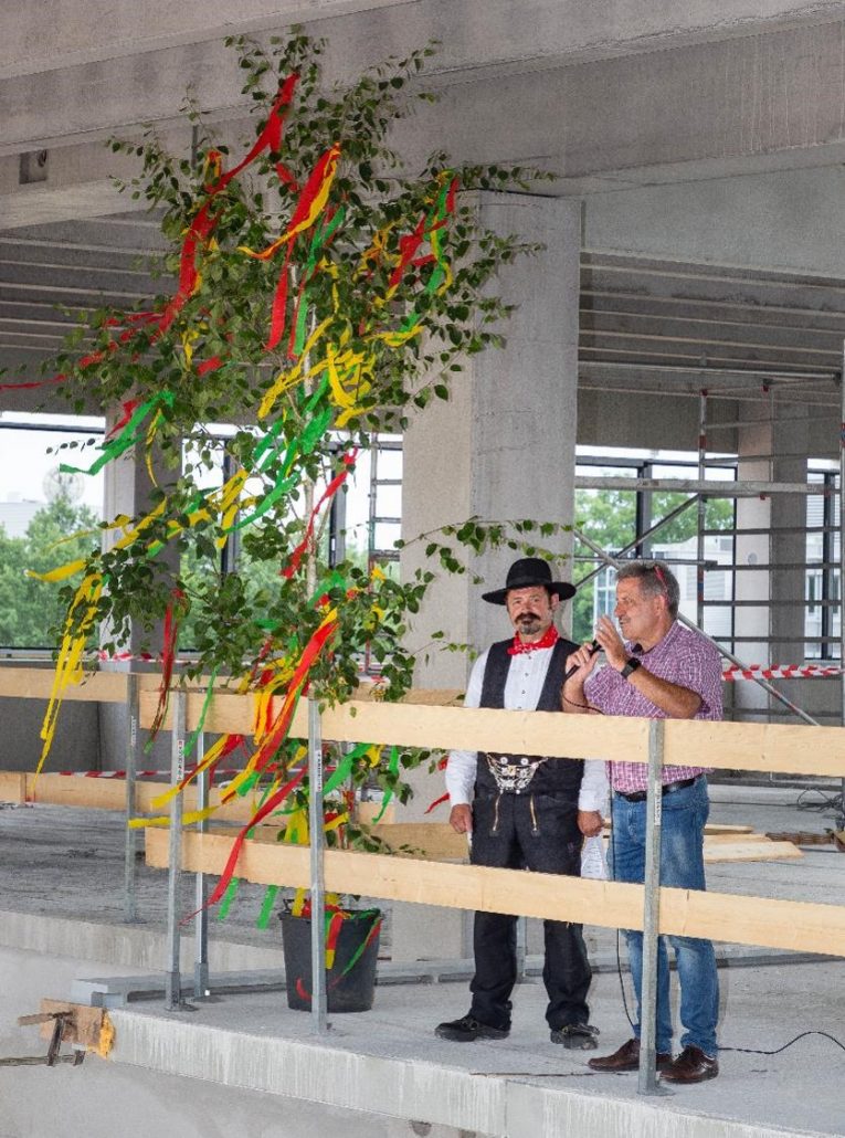 „Mit Gunst und Verlaub, es ist seit guter alter Zeit der Brauch, das Richtfest zu begehen. Das meint der Bauherr sicher auch und all die Leut’ die heut hier stehen. Ein Dach aus Holz, das seht ihr nicht, innovativ, modern mit neuem Gesicht. Hier waren Beton, Glas und Stahl für den Statiker erste Wahl. Die Architekten, Betonleut’ und Maschinisten, die Helfer und Büroartisten, sie alle haben keine Müh’ gescheut und es entstand der Bau in Rekordzeit“, said carpenter Johannes Schmitz, who then had the glass smashed traditionally on the ground.